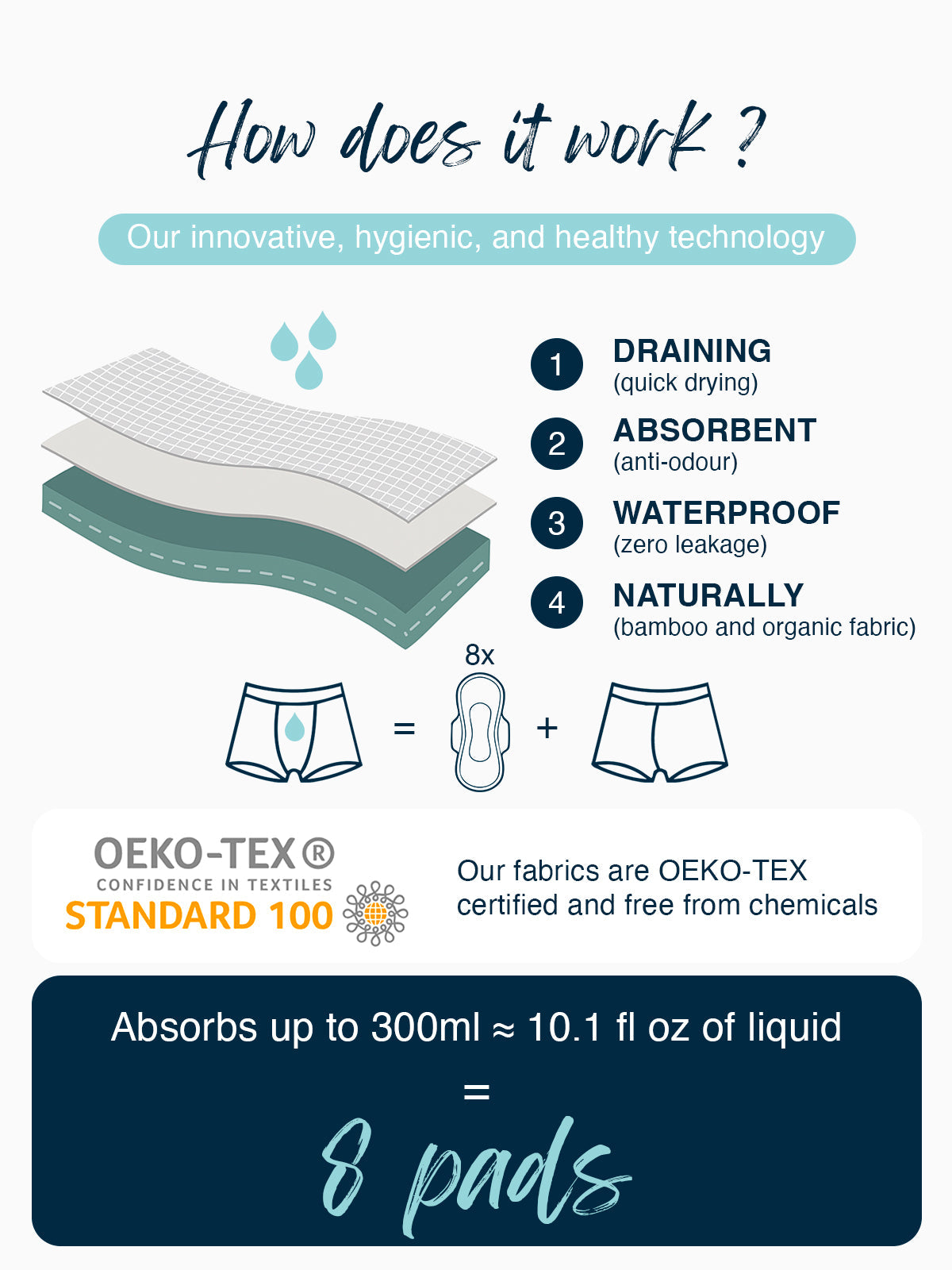 Our ultra-absorbent incontinence boxer shorts hold the equivalent of up to 8 regular pads. Depending on your flow, they offer up to 12 hours of day or night protection. For heavier leaks, we recommend changing them as soon as you start feeling damp.