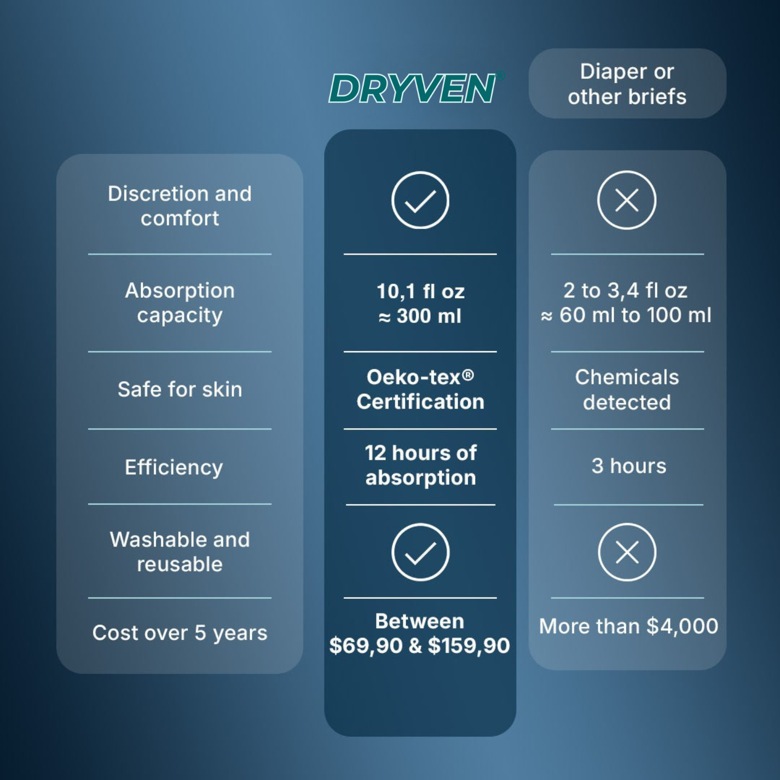 Dryven® briefs keep you dry, discreet, and confident—up to 3× more absorbent than regular underwear. Feel free. Feel unstoppable. Live your life without limits